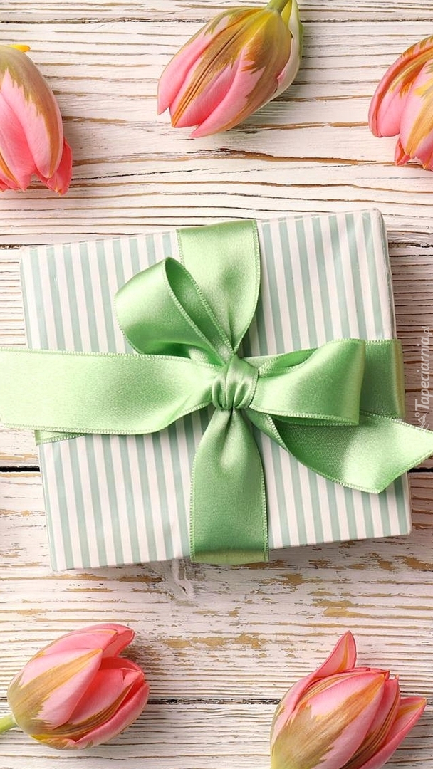 Edytor tapety: Prezent i tulipany na deskach