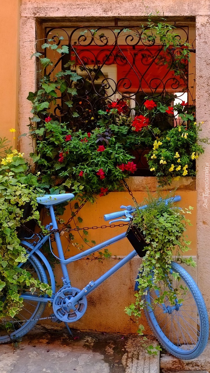 Edytor tapety: Rower z kwiatami pod oknem