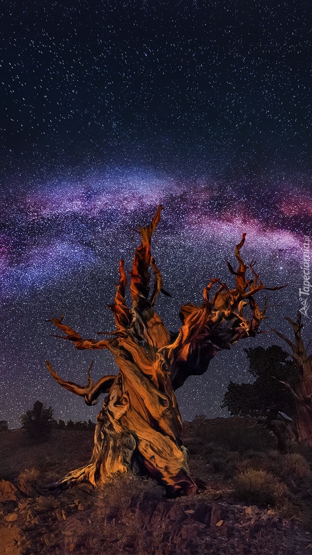 Edytor tapety: Rozgwieżdżone niebo nad uschniętym drzewem