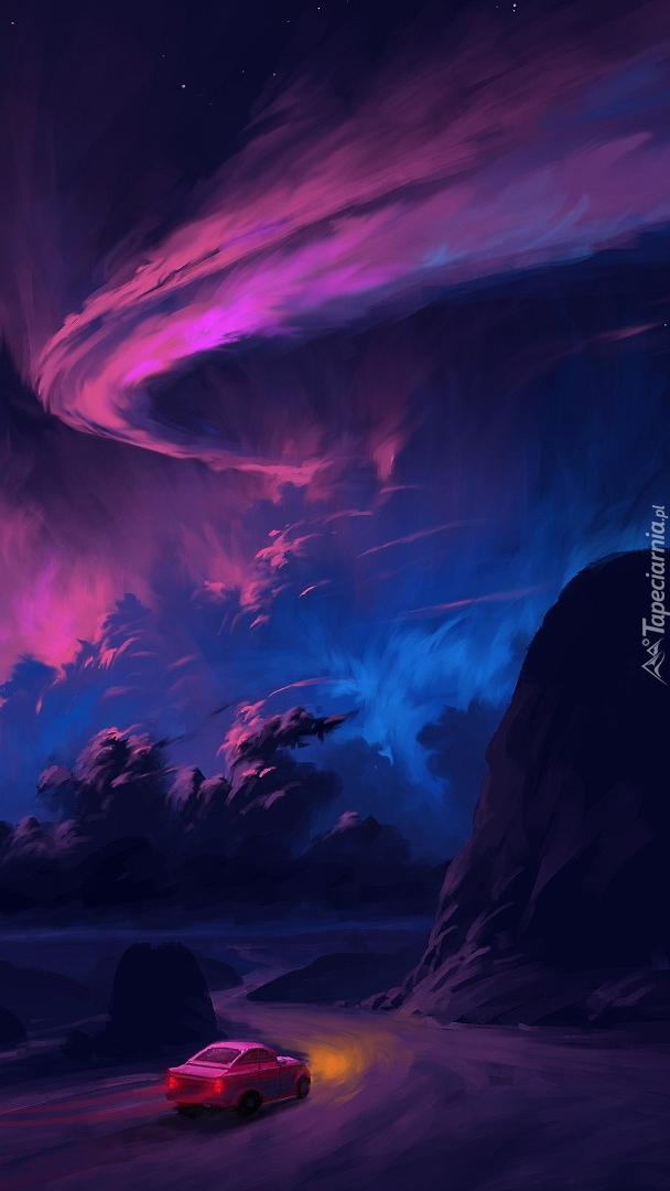Edytor tapety: Kolorowe chmury nad skałami i drogą