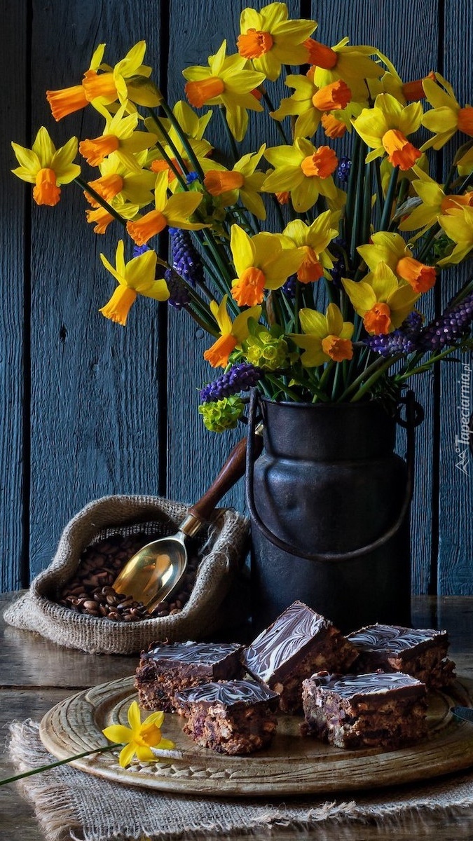 Edytor tapety: Żonkile w dzbanku obok ciasta