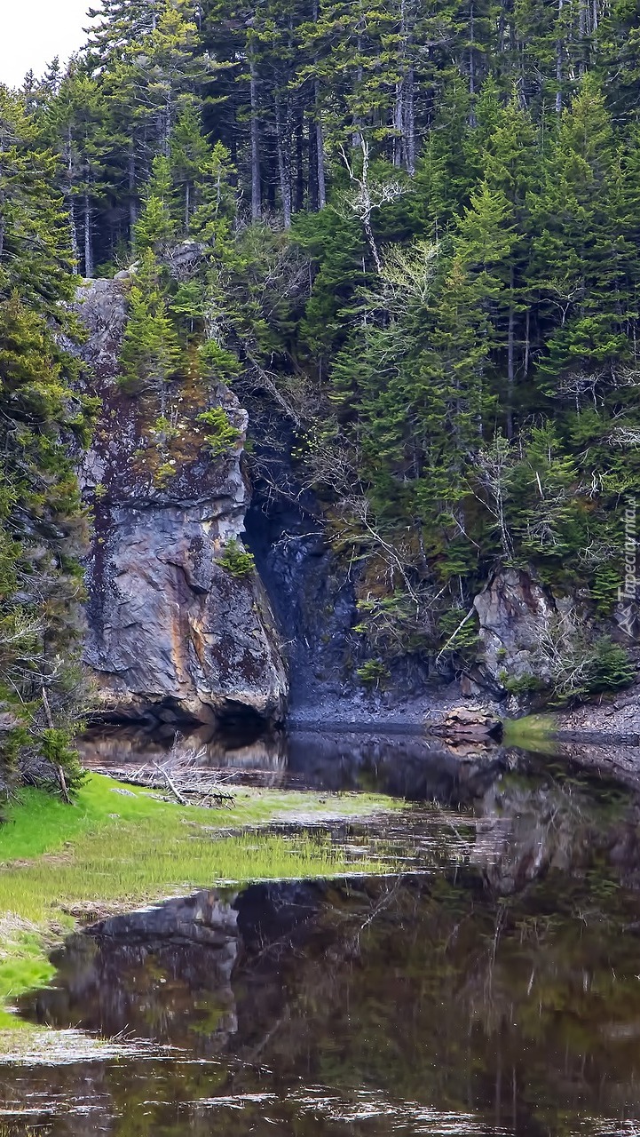 Edytor tapety: Drzewa na skałach nad stawem