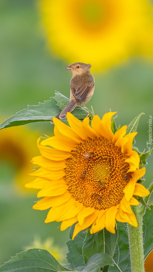 Edytor tapety: Prinia płowa na liściu słonecznika