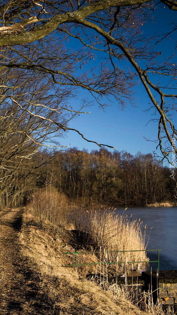 Edytor tapety: Drzewa i suche trawy nad stawem