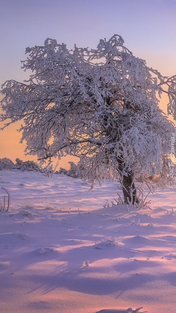 Edytor tapety: Ośnieżone drzewo o zachodzie słońca