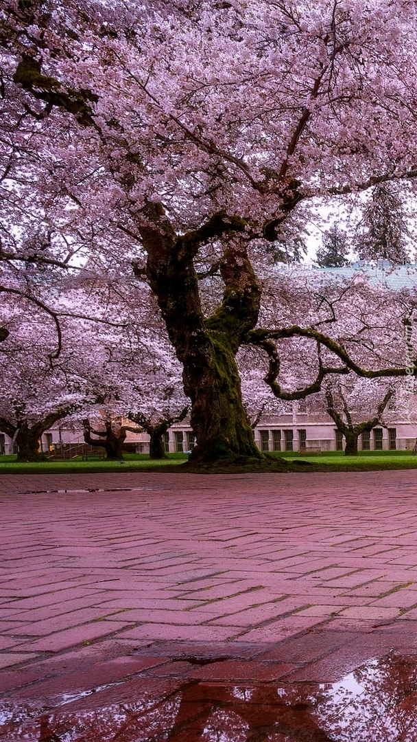 Edytor tapety: Kwitnące drzewa przed Uniwesytetem Quad