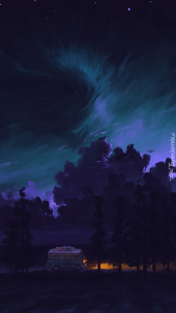 Edytor tapety: Rozświetlone nocą niebo nad lasem
