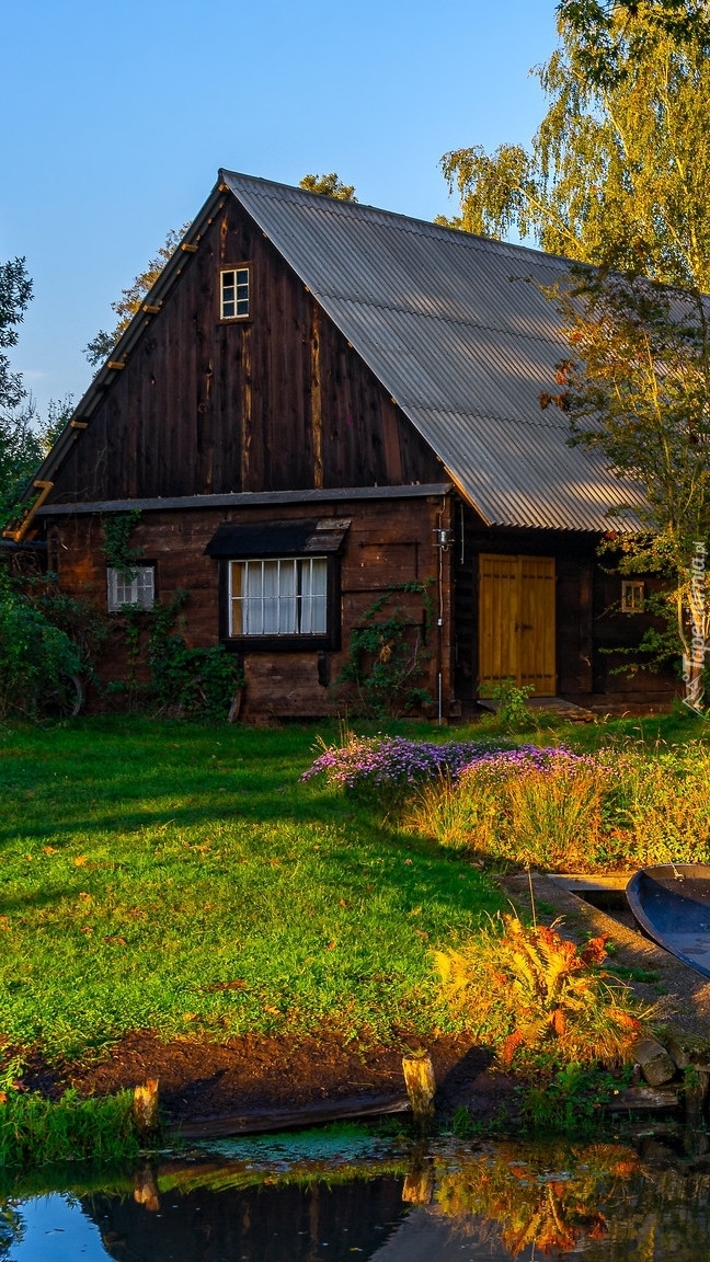 Edytor tapety: Drewniany dom nad stawem