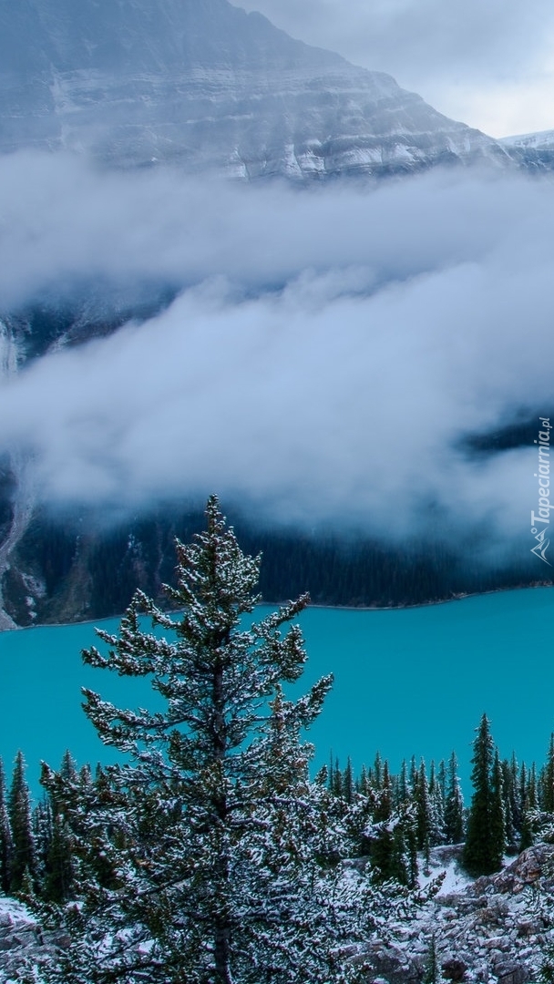 Edytor tapety: Opadająca mgła nad jeziorem Peyto Lake