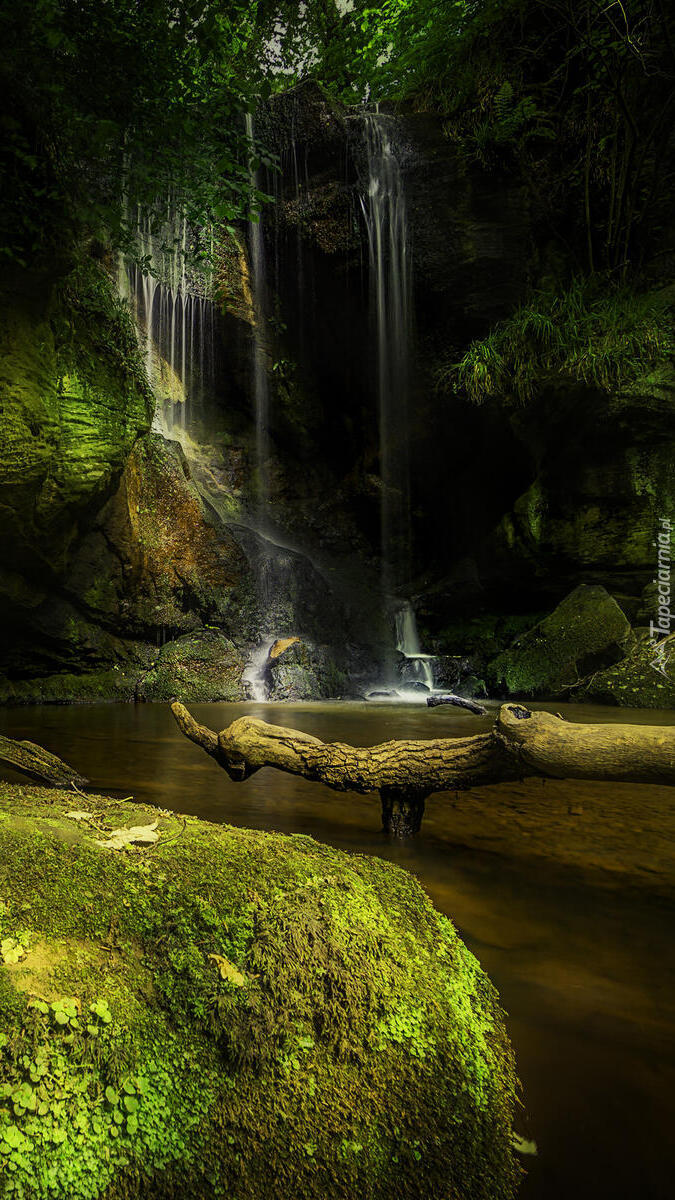 Edytor tapety: Rozświetlone skały przy wodospadzie