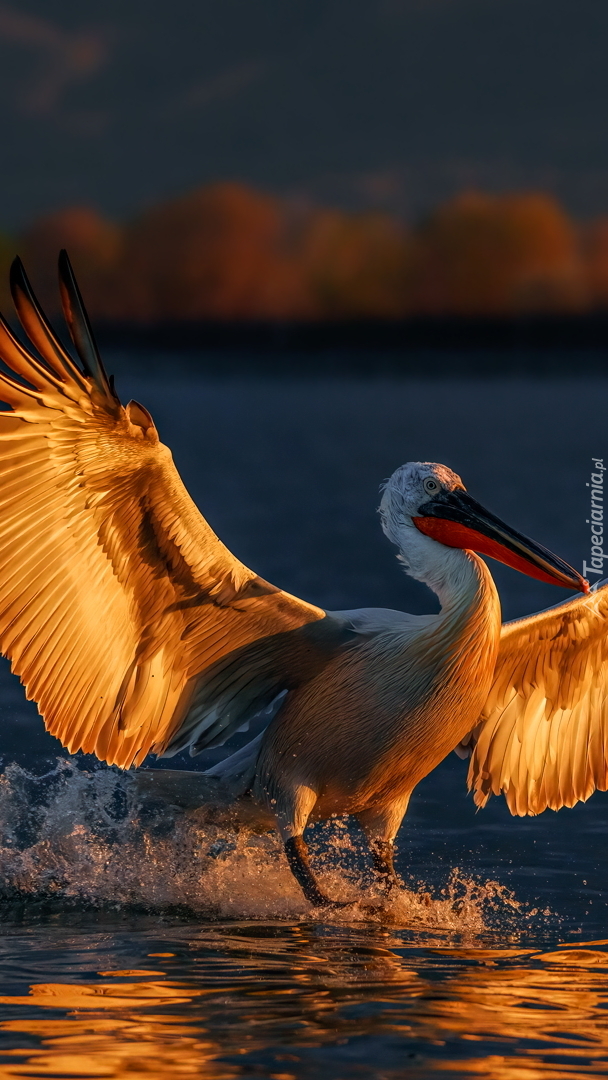 Edytor tapety: Pelikan kędzierzawy z rozpostartymi skrzydłami