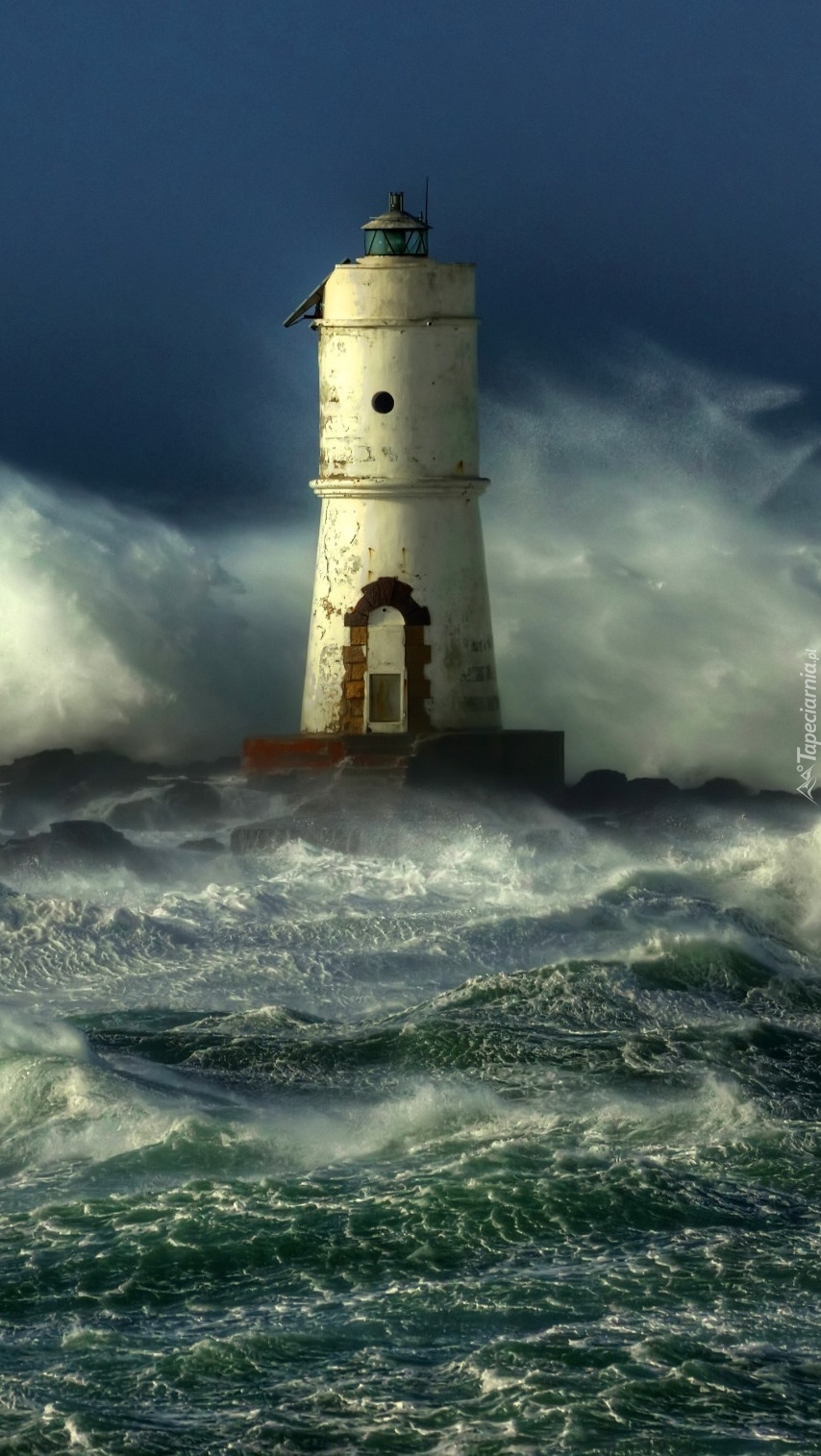 Edytor tapety: Latarnia na brzegu wzburzonego morza