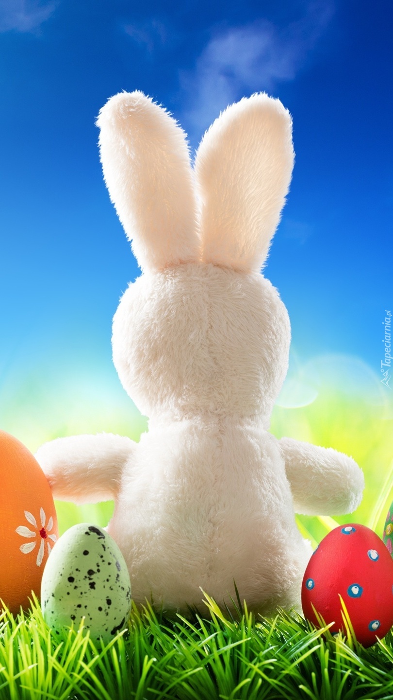 Edytor tapety: Biały zajączek i pisanki na trawie