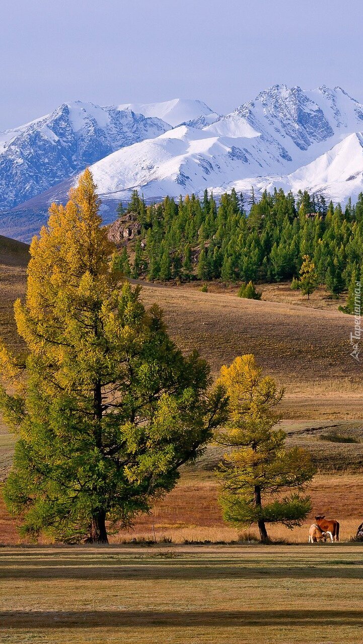 Edytor tapety: Drzewa na tle ośnieżonych gór