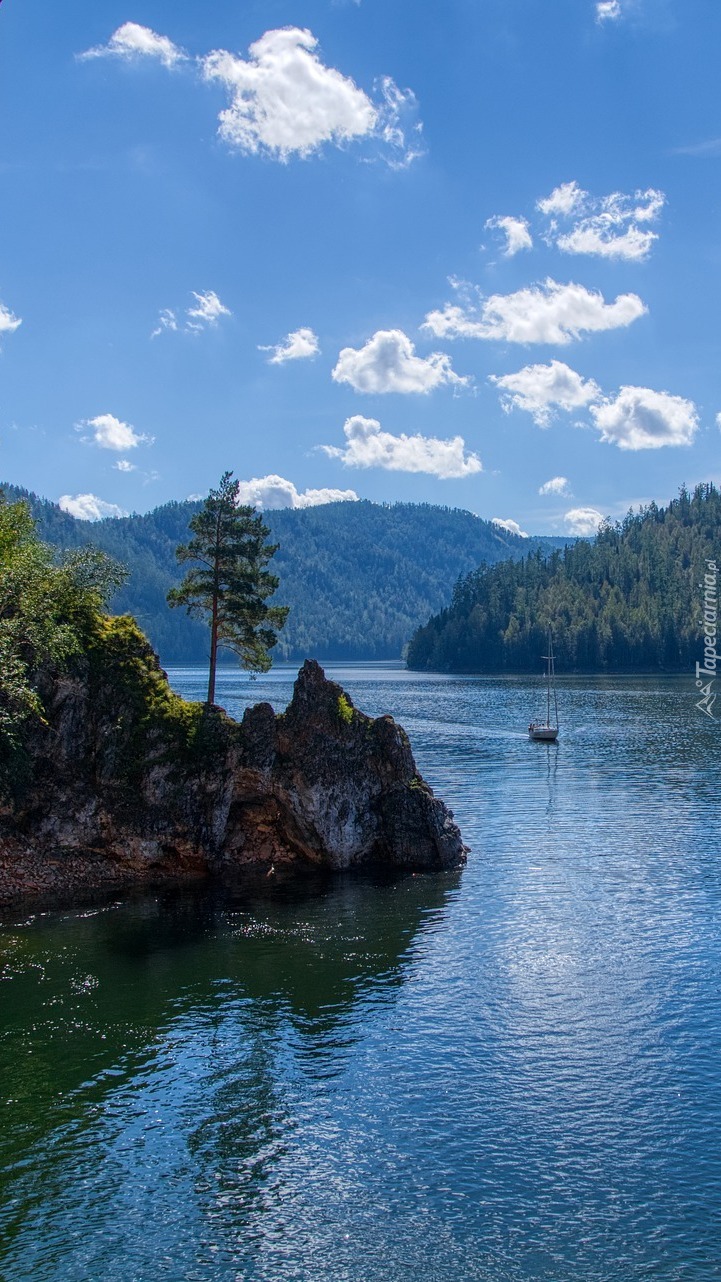 Edytor tapety: Drzewa na skałach nad jeziorem
