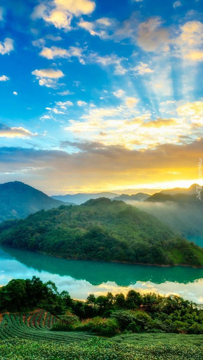 Edytor tapety: Słońce wyzierające zza chmur nad górami