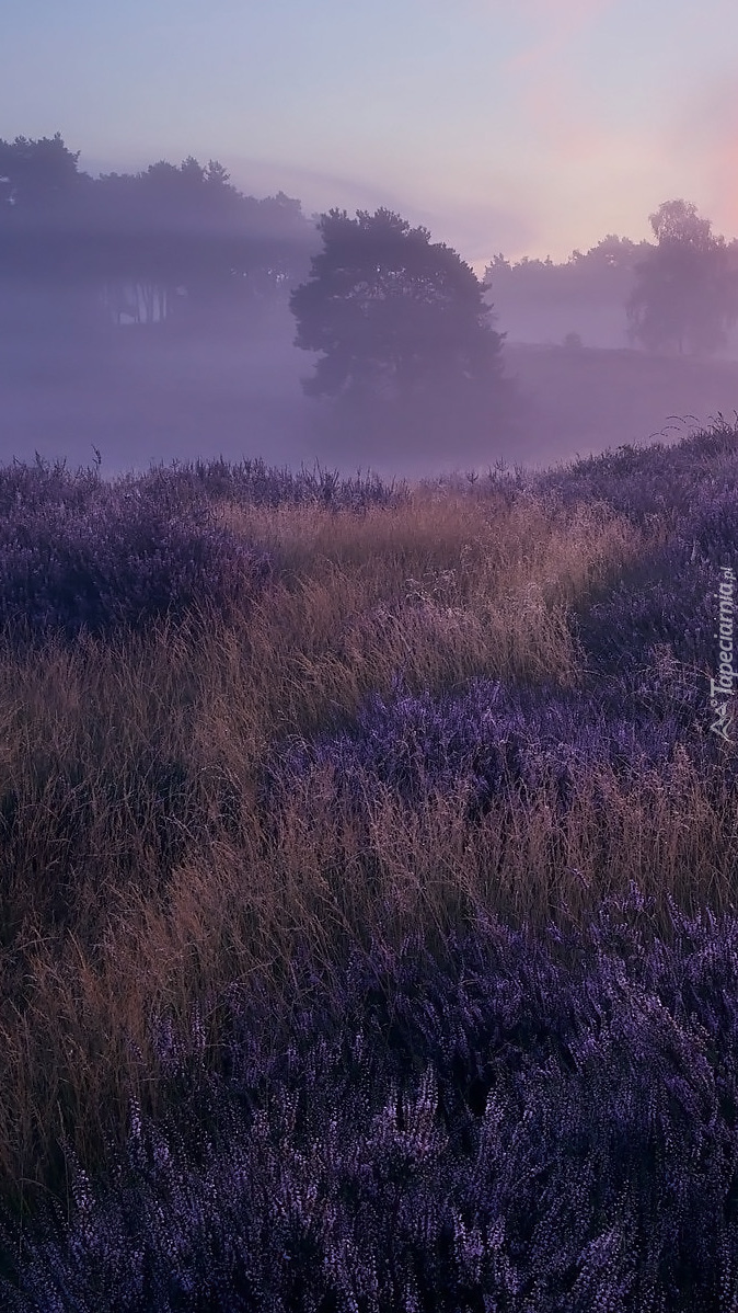 Edytor tapety: Wrzosowisko i drzewa we mgle