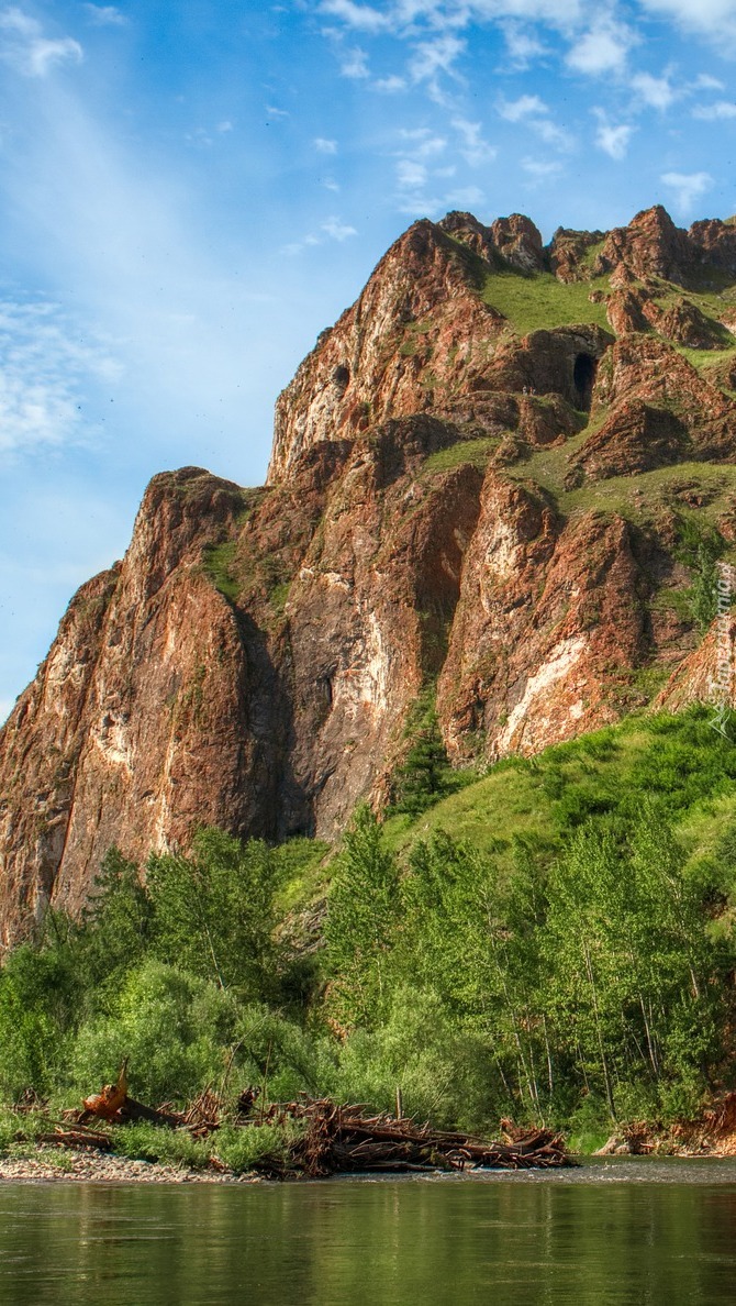 Edytor tapety: Skały i drzewa nad górską rzeką