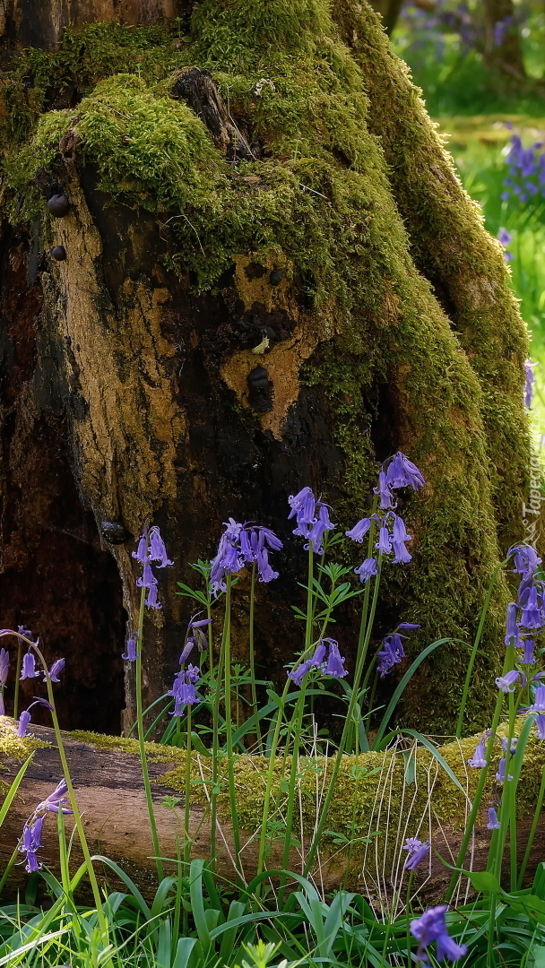 Edytor tapety: Fioletowe dzwonki obok omszałego pnia drzewa