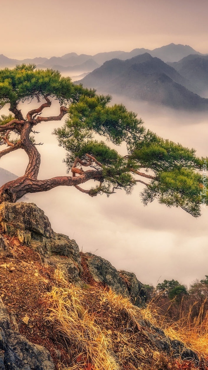 Edytor tapety: Sosna nad zamglonymi górami