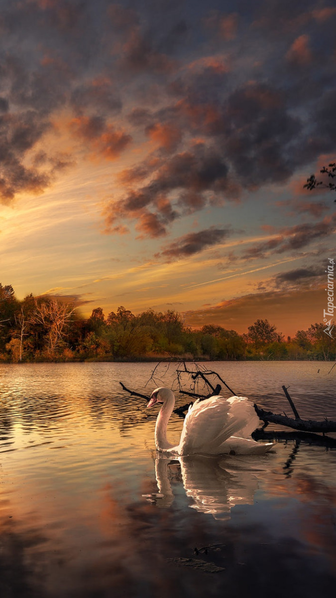 Edytor tapety: Łabędź obok konaru na jeziorze