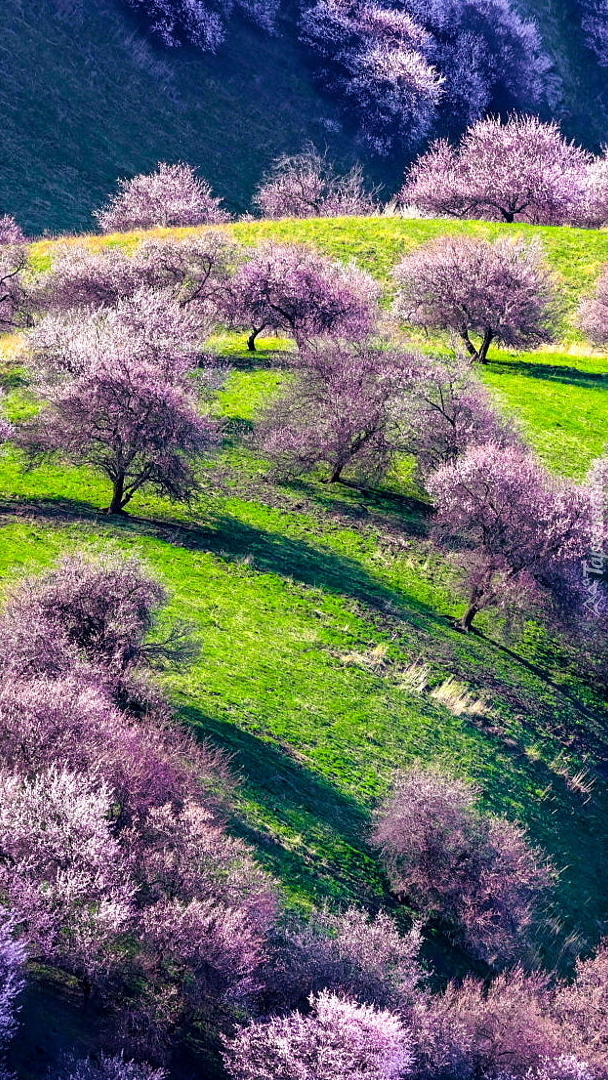 Edytor tapety: Okwiecone drzewa na zielonych wzgórzach