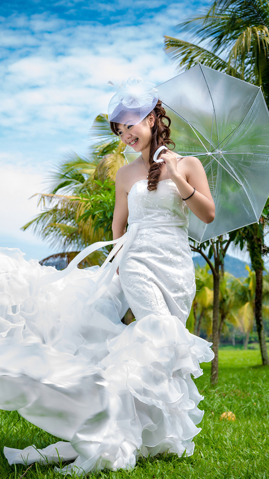 Edytor tapety: Panna młoda z parasolką na trawie