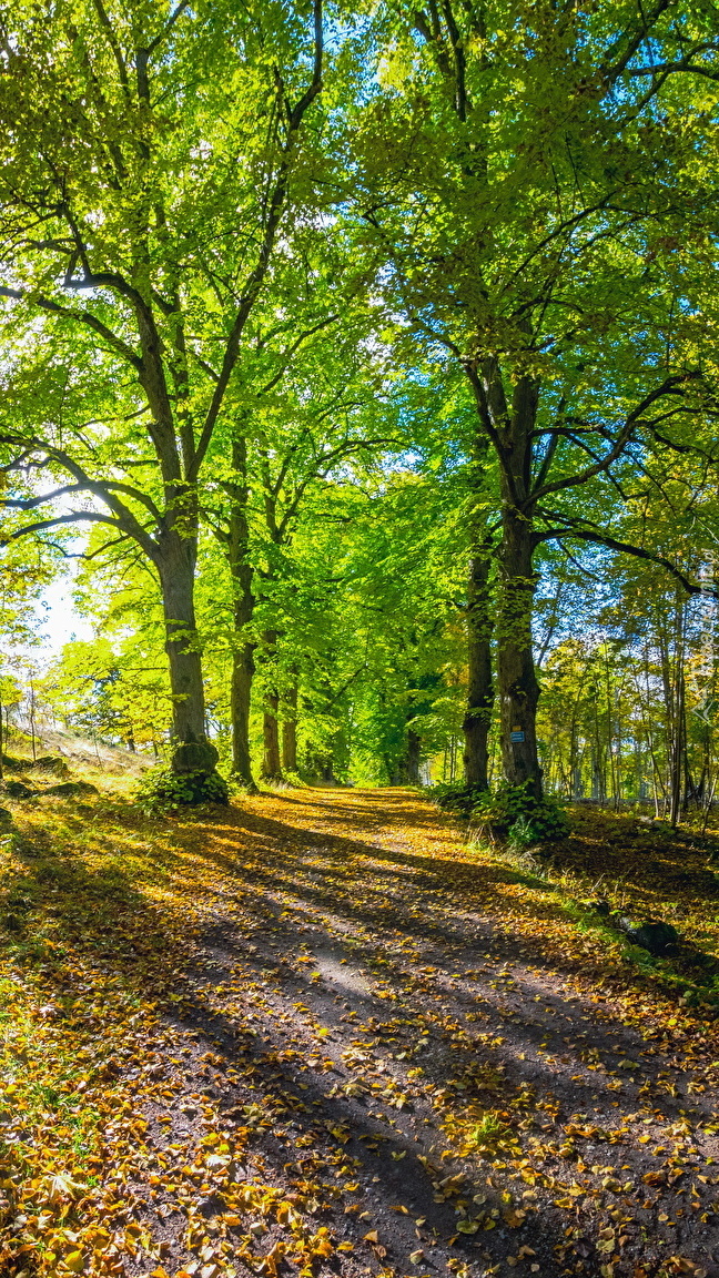 Edytor tapety: Ścieżka wśród drzew w zielonym lesie