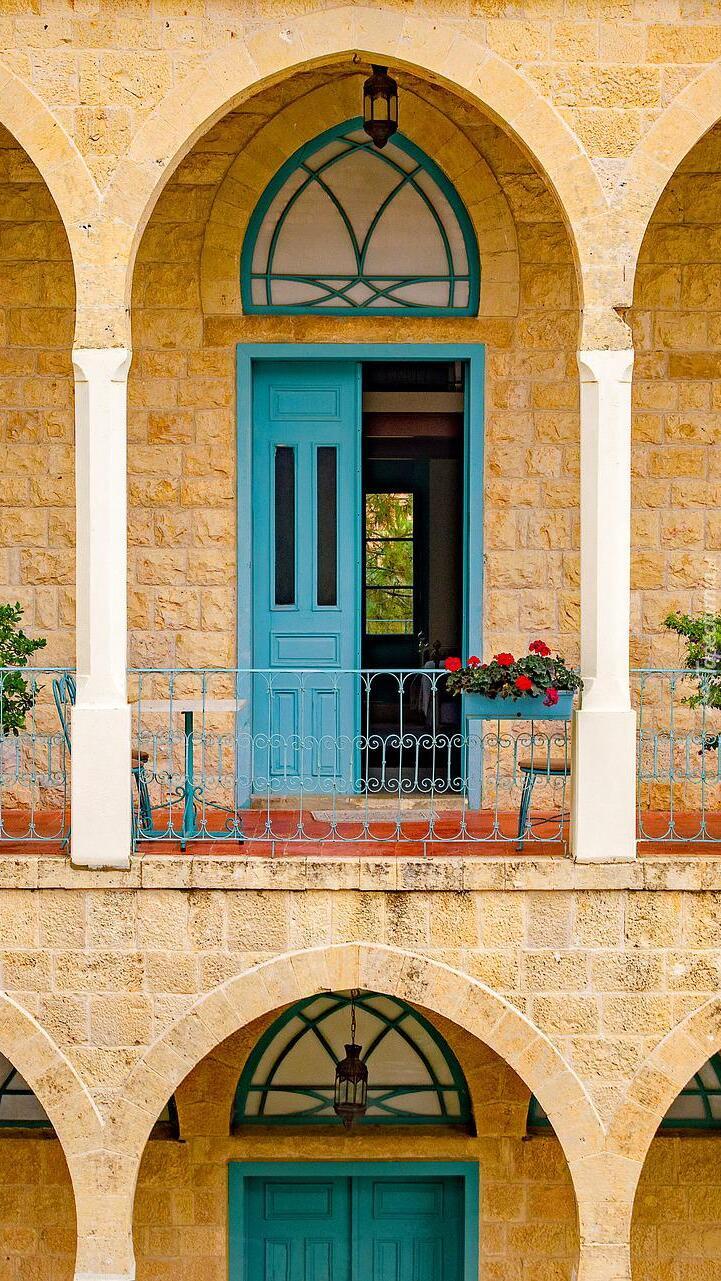Edytor tapety: Dom z niebieskimi drzwiami