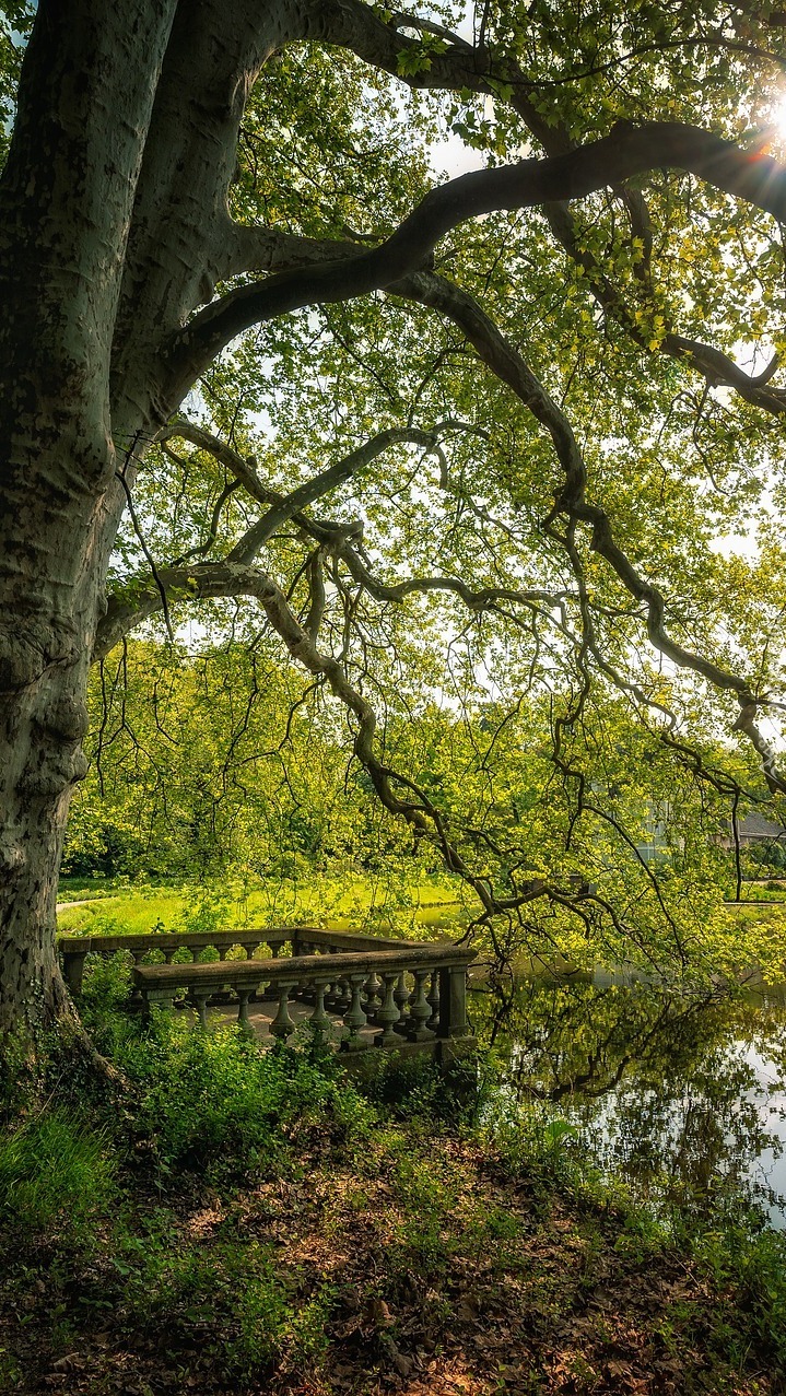 Edytor tapety: Rozłożyste drzewo nad stawem w parku