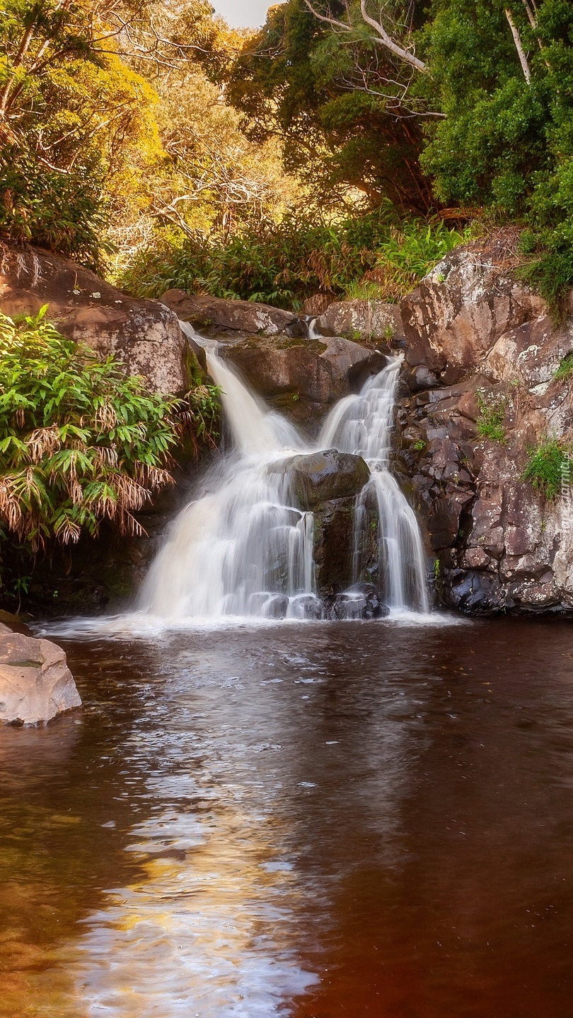 Edytor tapety: Kwitnące krzewy przy wodospadzie
