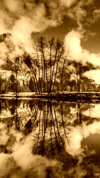 Edytor tapety: Odbicie drzew i ośnieżonych gór w rzece Merced River