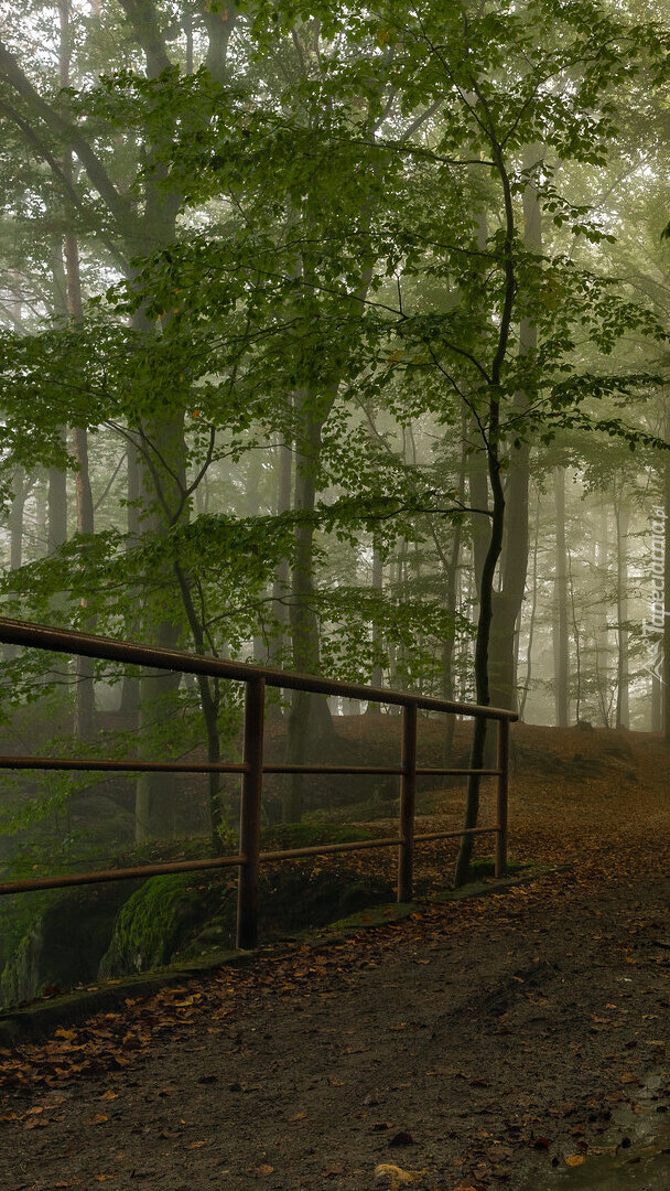 Edytor tapety: Barierka przy drodze w zamglonym lesie