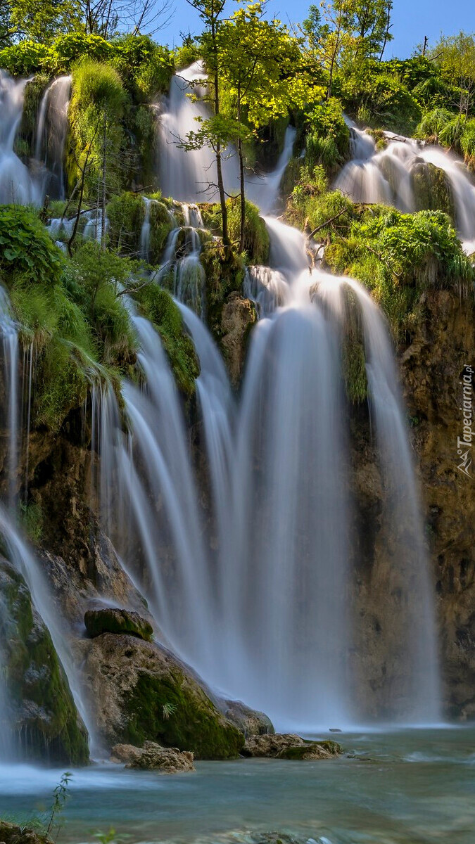 Edytor tapety: Rozświetlone wodospady na skałach