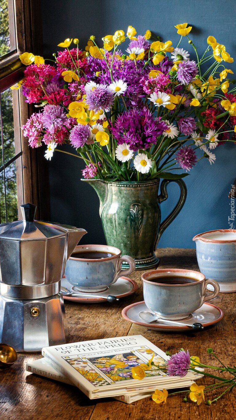 Edytor tapety: Bukiet kwiatów i filiżanki z kawą