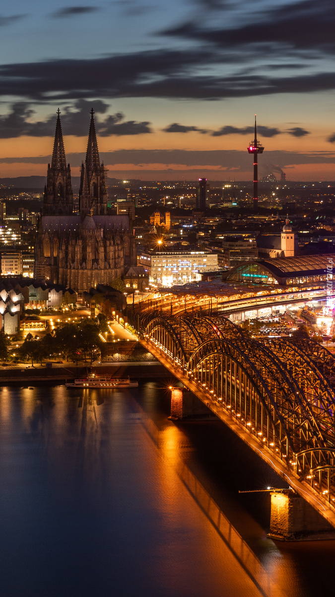 Edytor tapety: Oświetlony nocą most Hohenzollernów w Kolonii