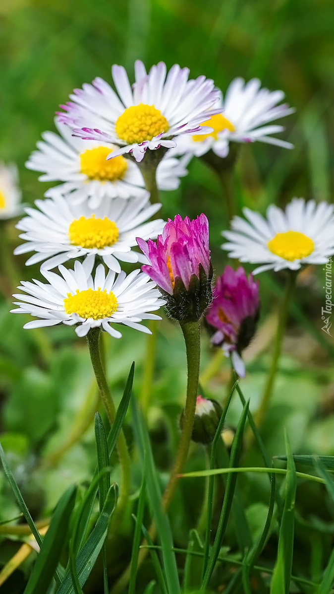 Edytor tapety: Różowe i białe stokrotki w trawie