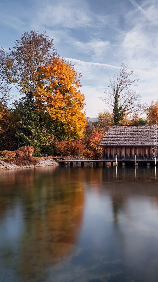 Edytor tapety: Drewniana szopa nad jeziorem Traunsee