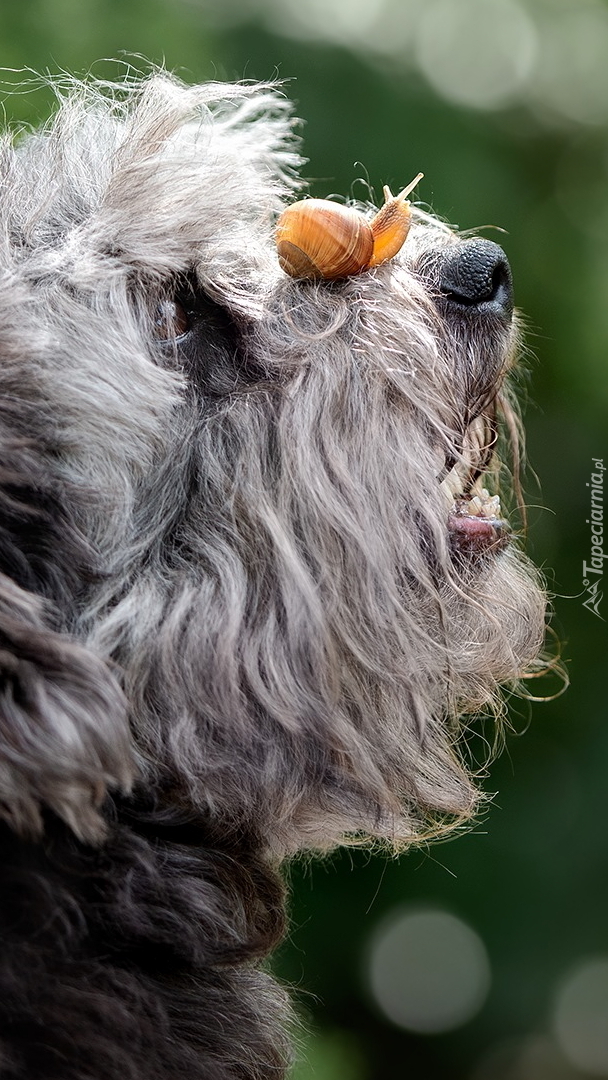 Edytor tapety: Ślimak na nosie kudłatego psa