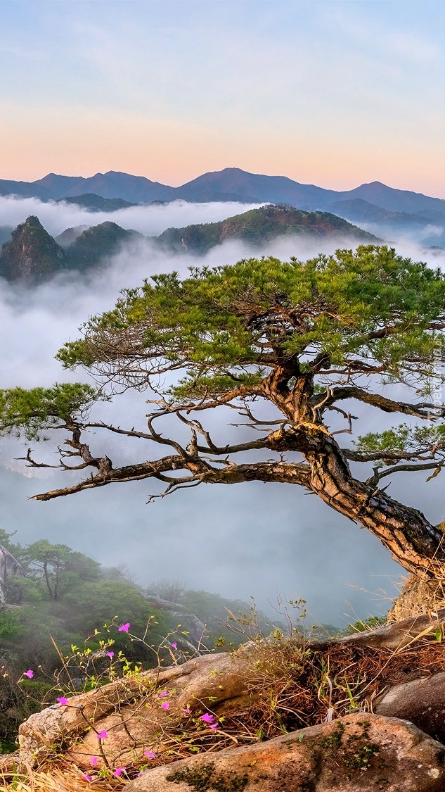 Edytor tapety: Pochylona sosna i mgła nad górami