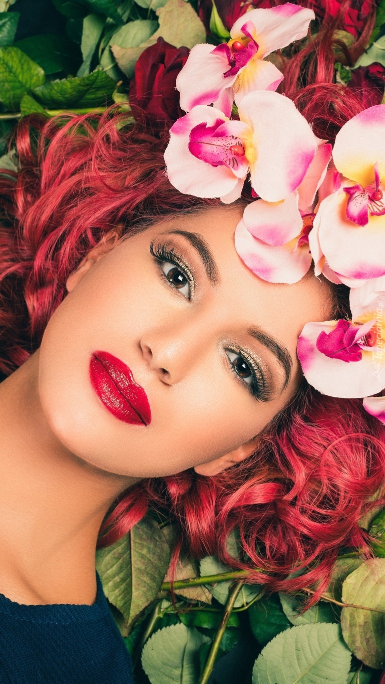 Edytor tapety: Kobieta z kwiatami storczyka na głowie