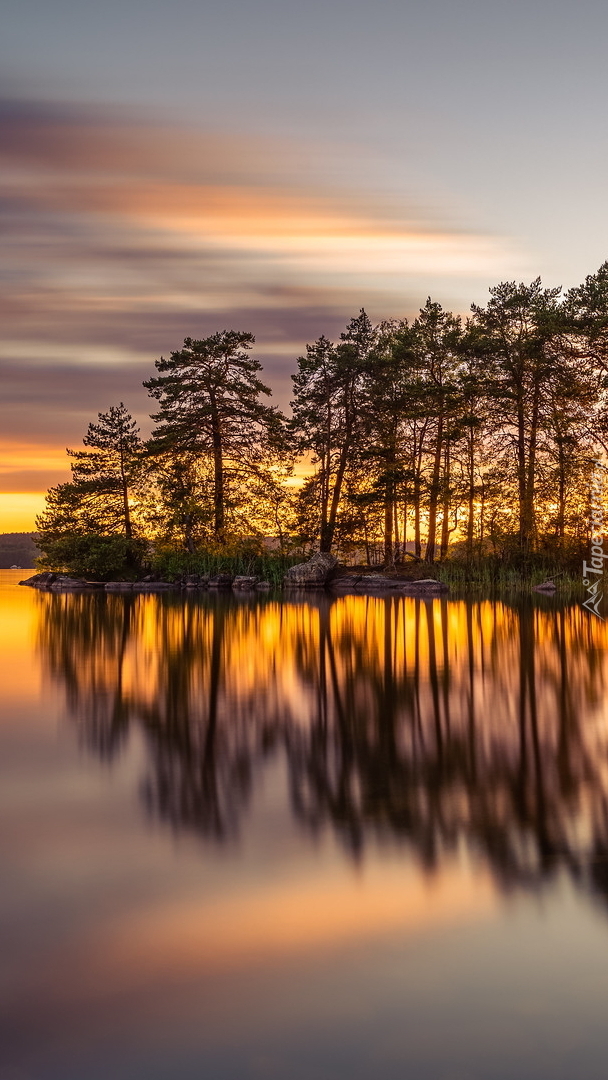 Edytor tapety: Drzewa o zachodzie słońca nad jeziorem