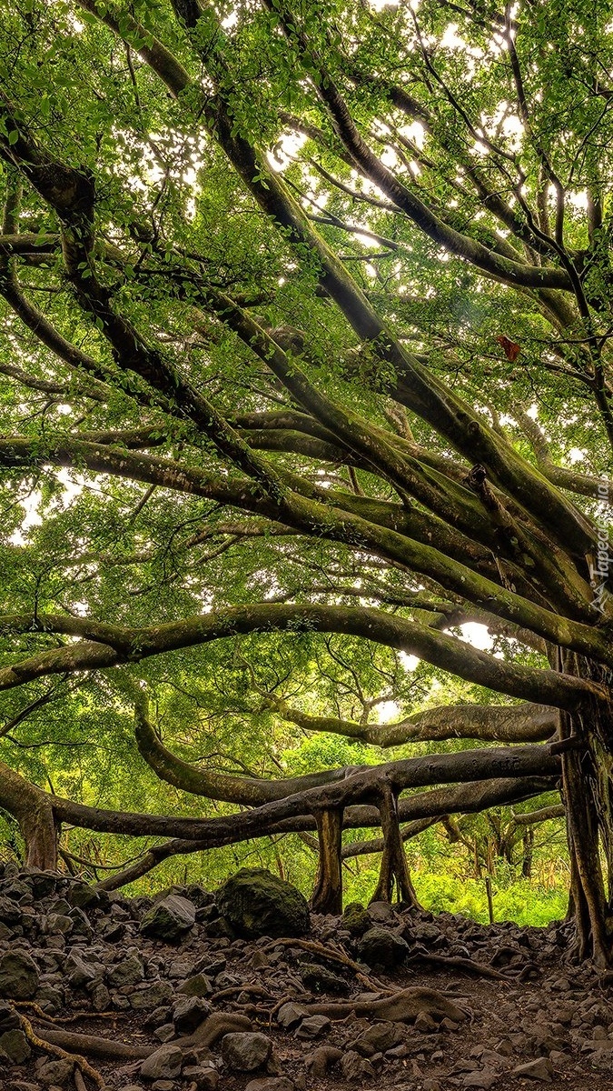 Edytor tapety: Kamienie pod rozłożystym drzewem liściastym