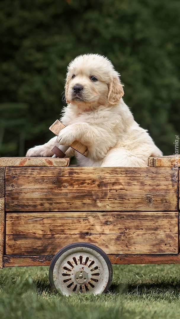 Edytor tapety: Szczeniak golden retriever w drewnianym wózku