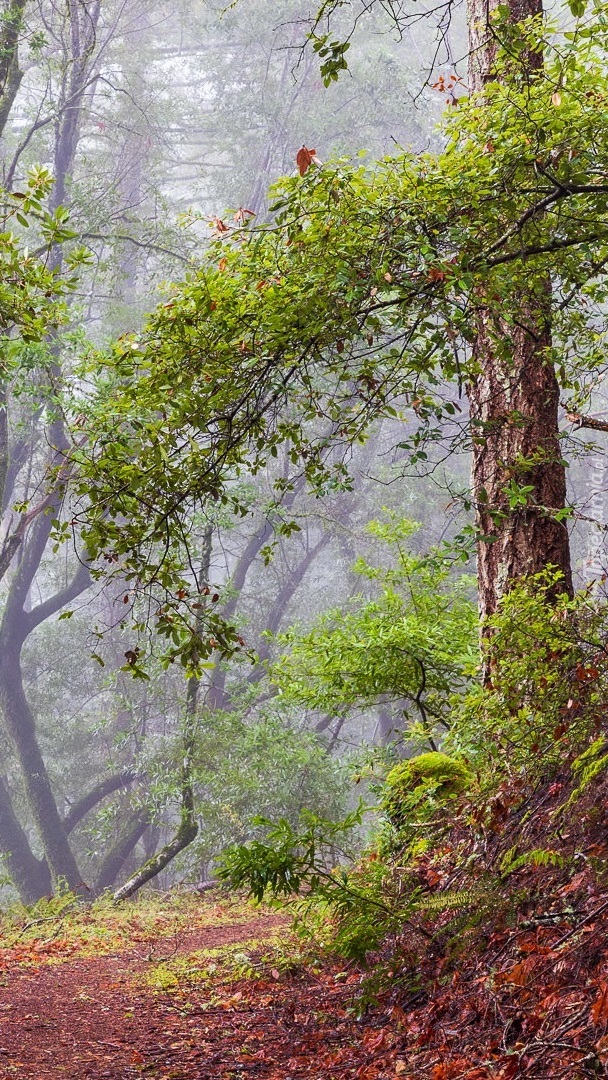 Edytor tapety: Drzewa przy drodze w zamglonym lesie