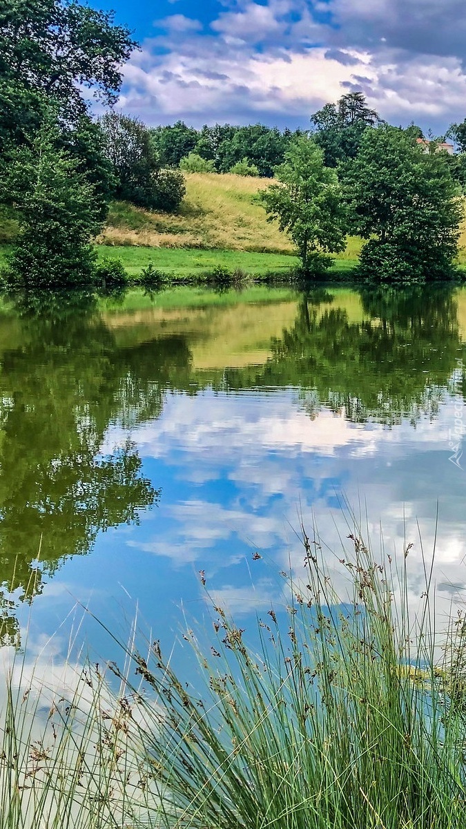 Edytor tapety: Zielone drzewa i trawa nad stawem