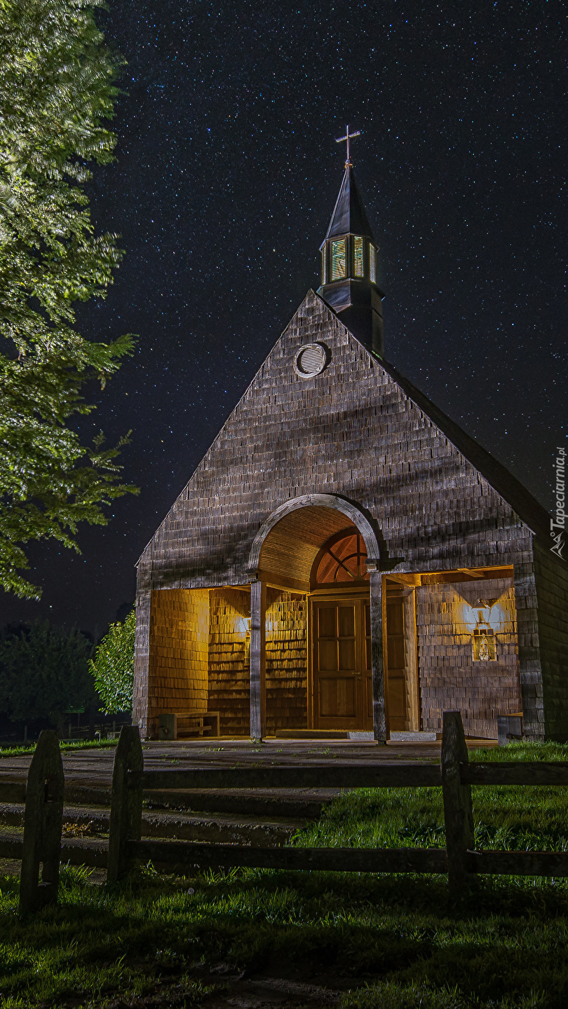 Edytor tapety: Oświetlony drewniany kościół pod gwiaździstym niebem