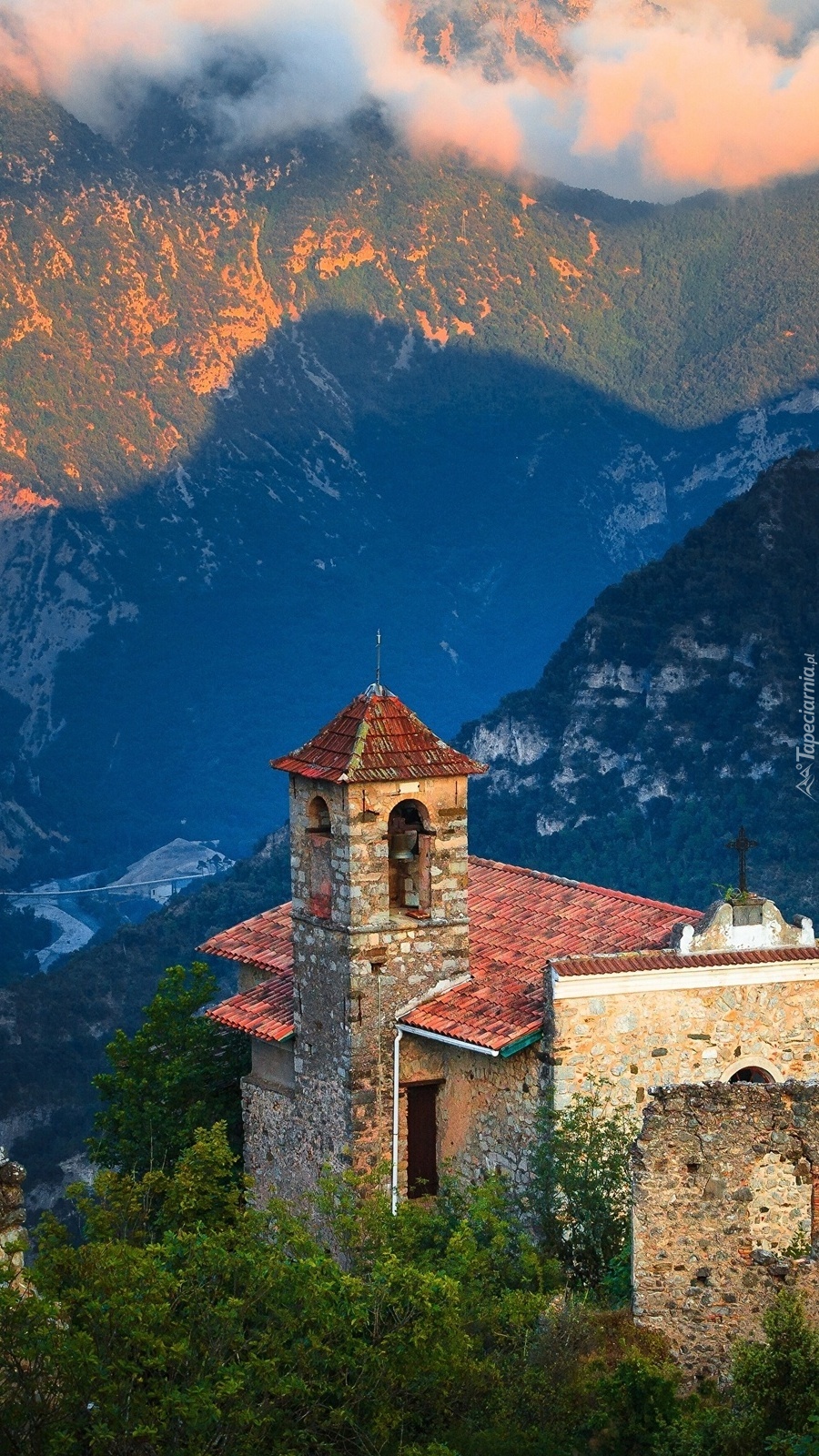 Edytor tapety: Kościół na tle górskiej doliny