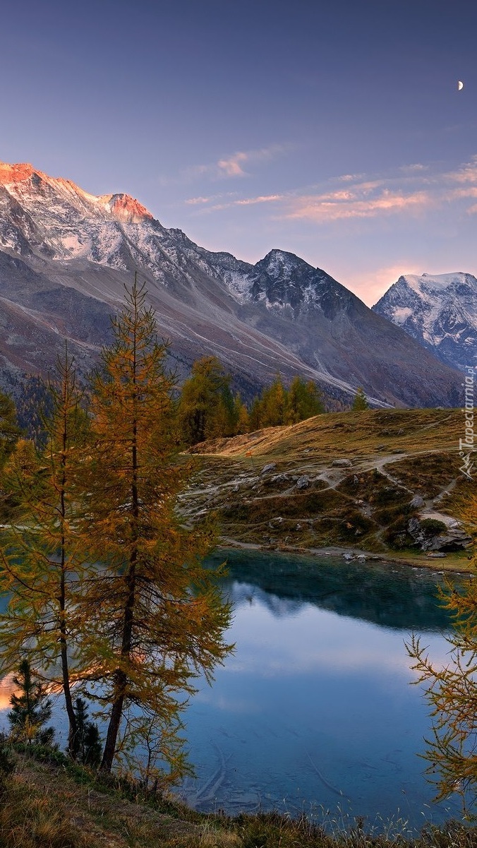 Edytor tapety: Pożółkłe modrzewie nad jeziorem w górach