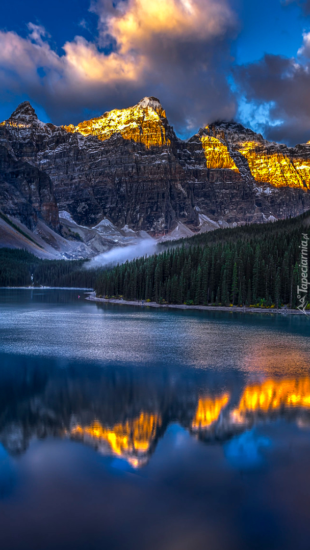 Edytor tapety: Rozświetlone szczyty nad jeziorem Moraine Lake